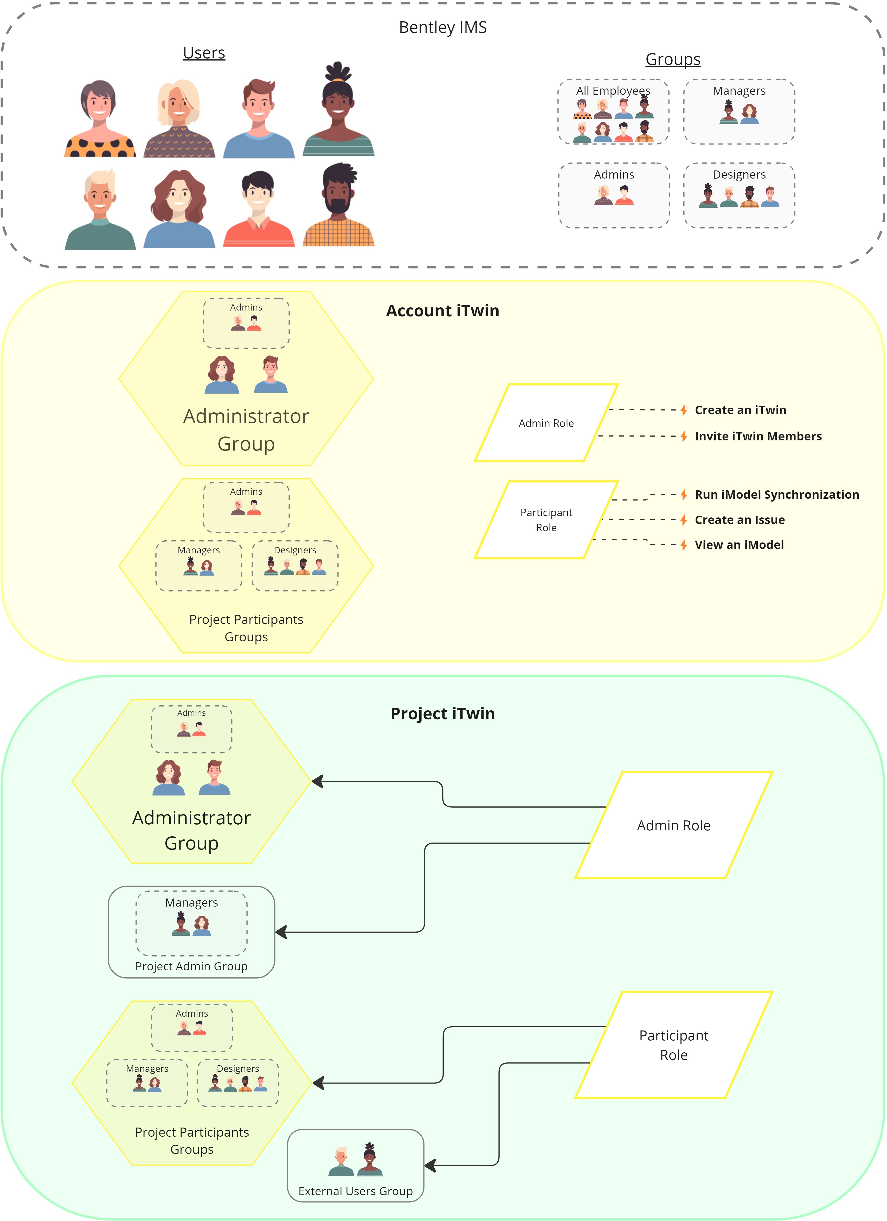 Groups can contain individual users. Groups can also reference Bentley Identity Management System (IMS) groups. By referencing an IMS group, you can manage groups of individuals in your Active Directory, while providing them access to iTwin Platform using role assignments.