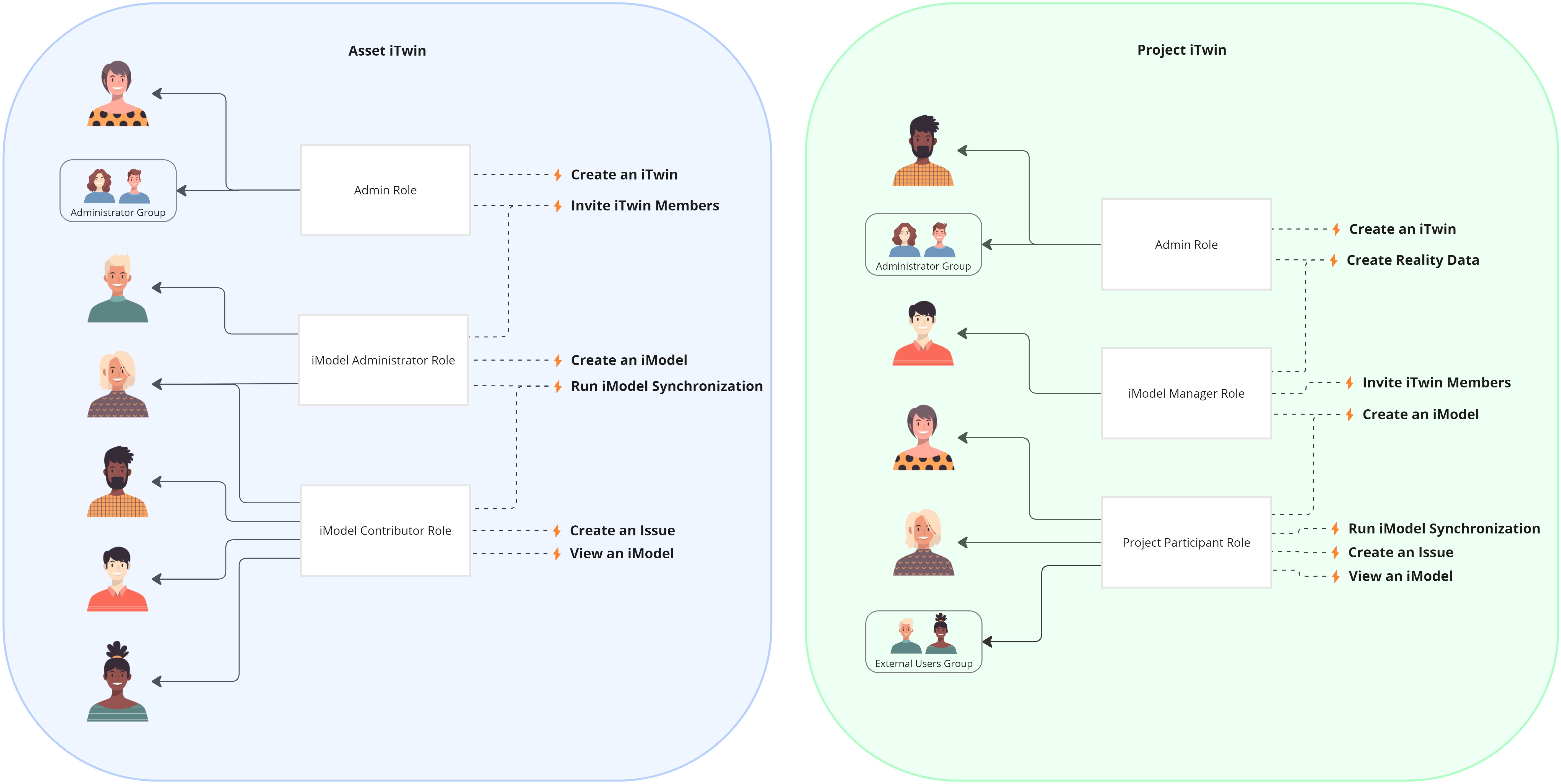 The Access Control API enforces iTwin permission isolation by allowing configuration of how roles are defined and assigned. Roles that are defined on an iTwin, can only be assigned on that iTwin. Likewise, the permission definition of a role is isolated on the iTwin in which its defined. The example below highlights this concept; Notice that the role definitions and their assignments vary on the two iTwins. Note: The only exception to that rule is Account Roles. See the Managing access using the Account iTwin section for more information.