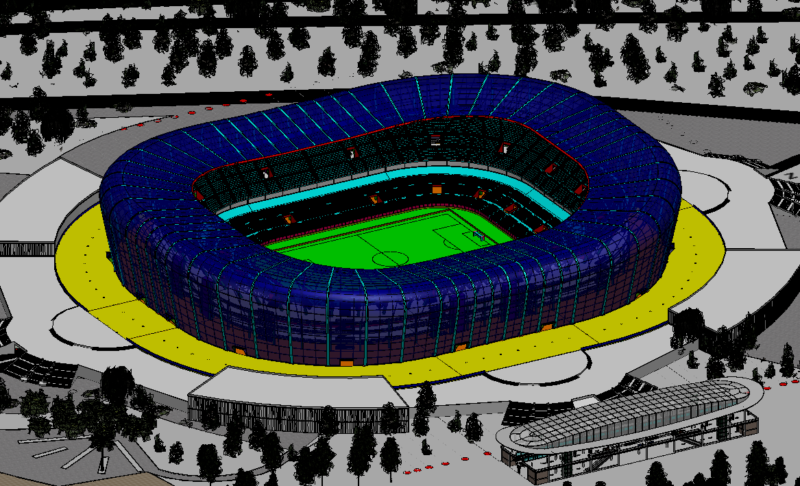 Soccer stadium in Singapore. Features landscape details and a metro station. This is the largest sample iModel.