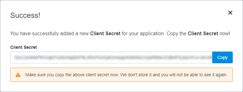 Make sure you copy and save your new Client Secret. We don't store it and you will not be able to see it again.