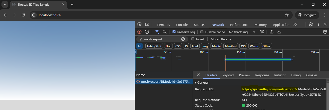 You can confirm that the Mesh Export API is being called correctly by checking the network tab in your browser's developer tools. You should see a request to api.bentley.com/mesh-export as shown below.