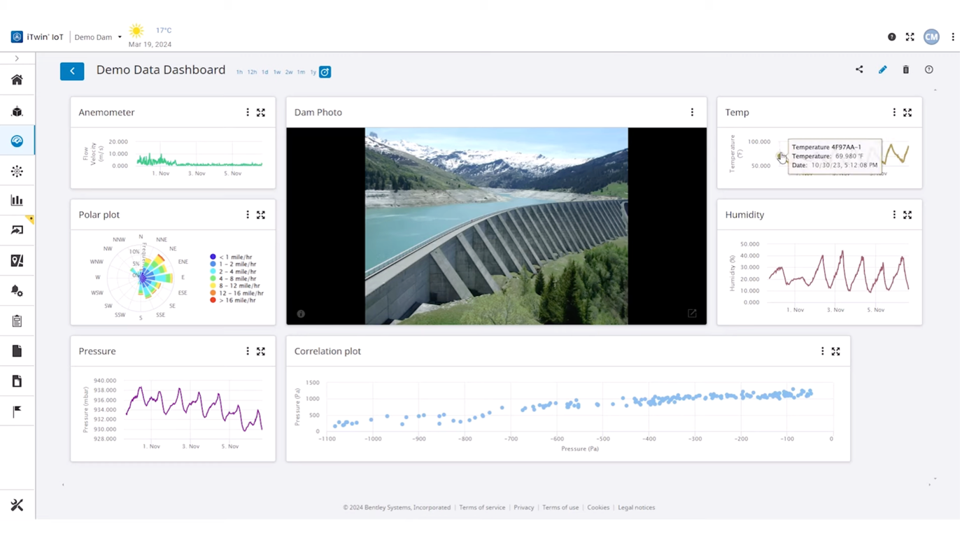 Integrating data from diverse IoT sensors can be complex, but iTwins simplify the process with a unified platform. Using the Sensor Data API, teams can consolidate data from multiple sources for real-time analysis and monitoring. Once integrated, users can visualize the asset’s sensor data using iTwin IoT on a unified dashboard, enabling informed, data-driven decisions.